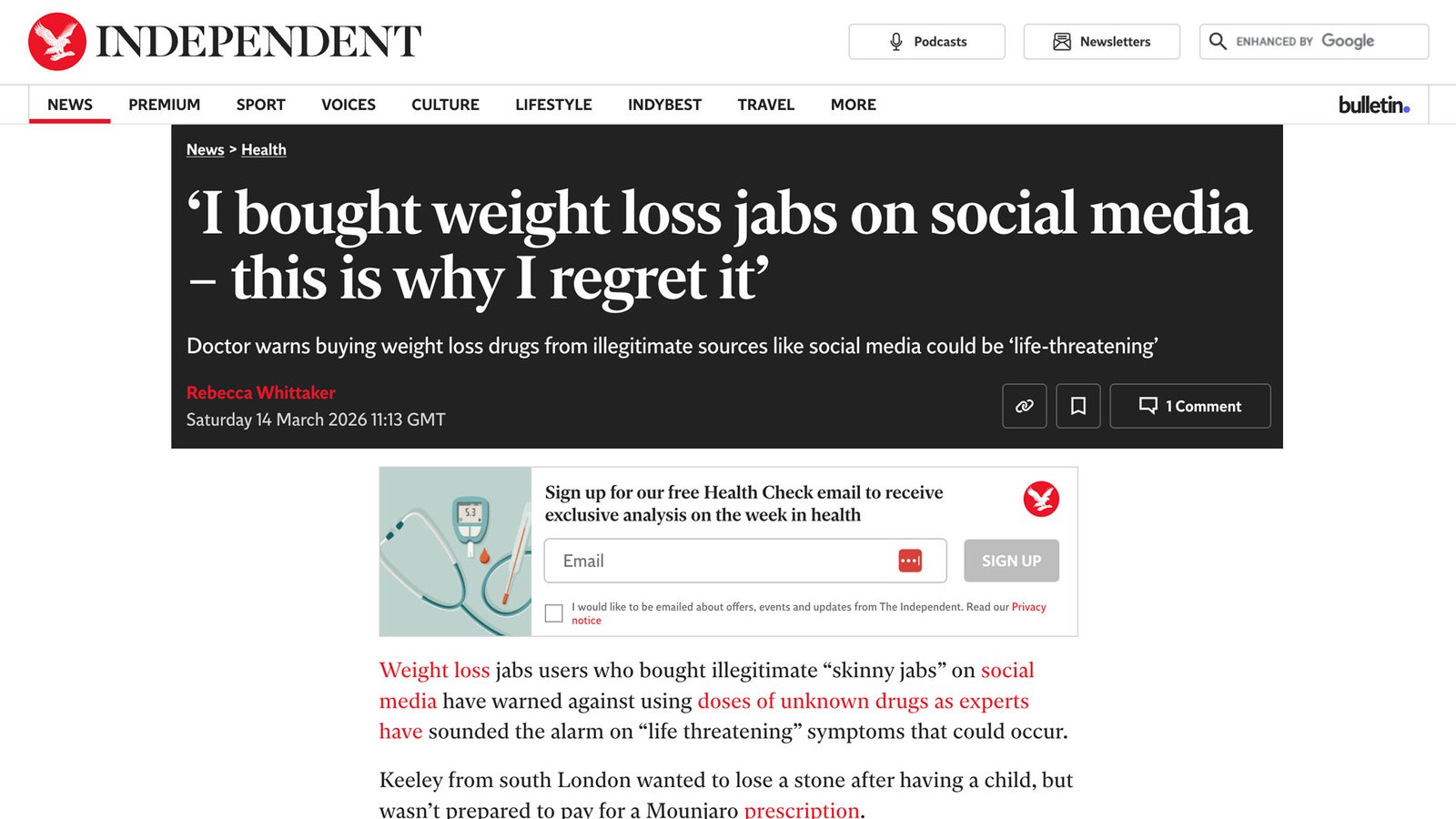 ‘I bought weight loss jabs on social media – this is why I regret it’ chris14 April 2026Press Releases ‘I bought weight loss jabs on social media – this is why I regret it’ READ FULL ARTICLE